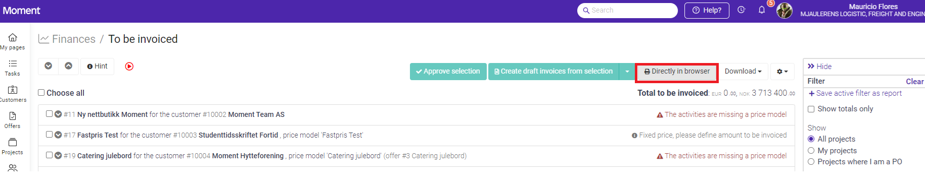 To be invoiced is one of the most important tabs under *Finances* as it gives total control and overview of invoicing inn Moment. This tab is company-wide and will include all the projects on the company unless defined otherwise in the report filter. The functionality is the same as in *to be invoiced* at project level.