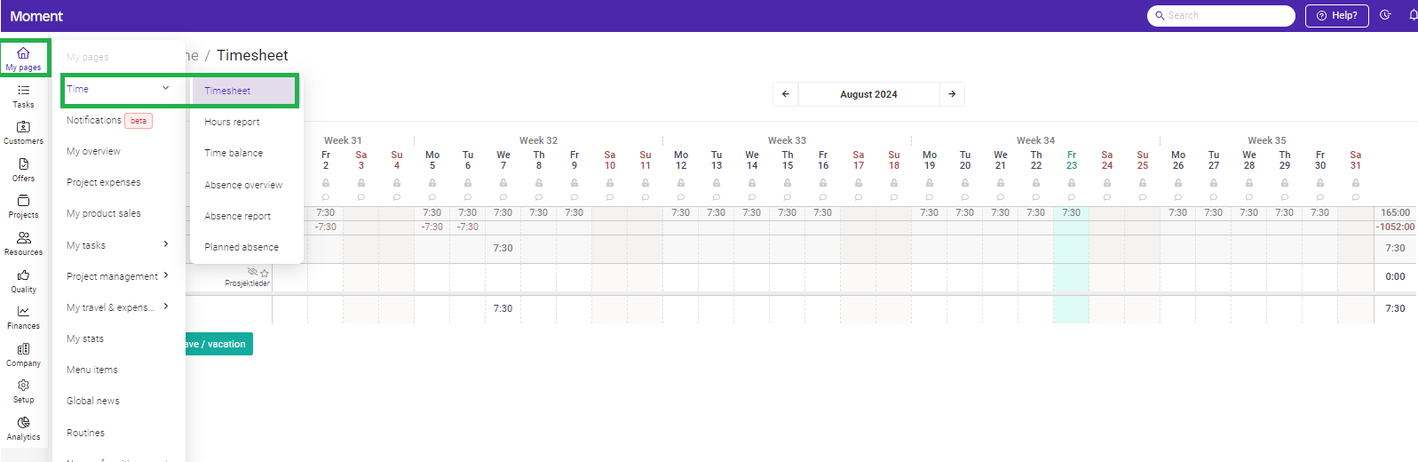 Time and absence registration are the core in Moment. The hours you put in are the basic input for everything else that happens in the program. Hence, this functionality is the first you should learn.