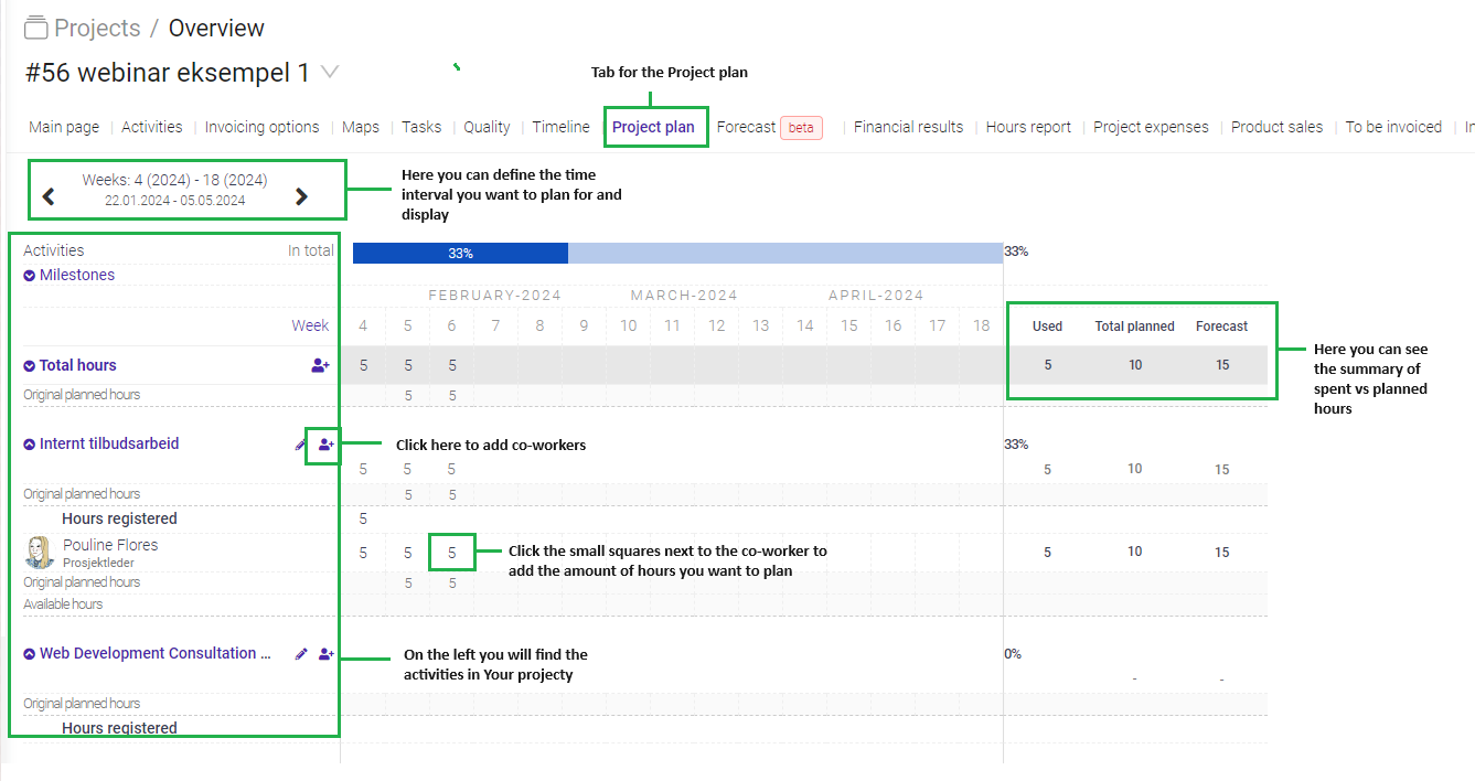 The **Project Plan** is a tool that allows you to schedule and track the progress of your project week by week. It helps you plan the hours for your team members, monitor how many hours have been used, and compare them with the planned and forecasted hours.
