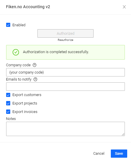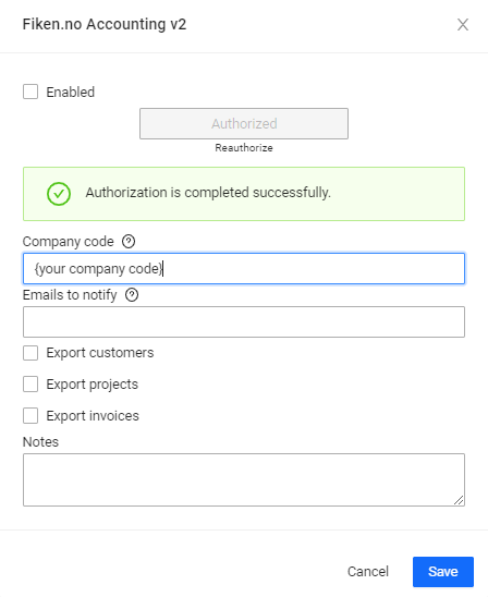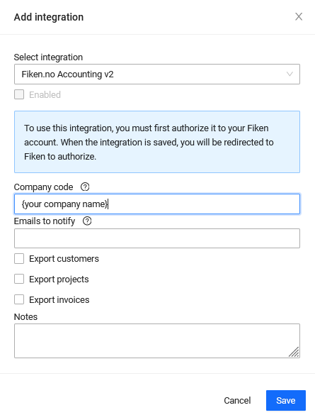 To use Fiken the integration needs to be authorized. When adding the integration in Moment the field for company code is required. When this has been entered, you can save the integration.