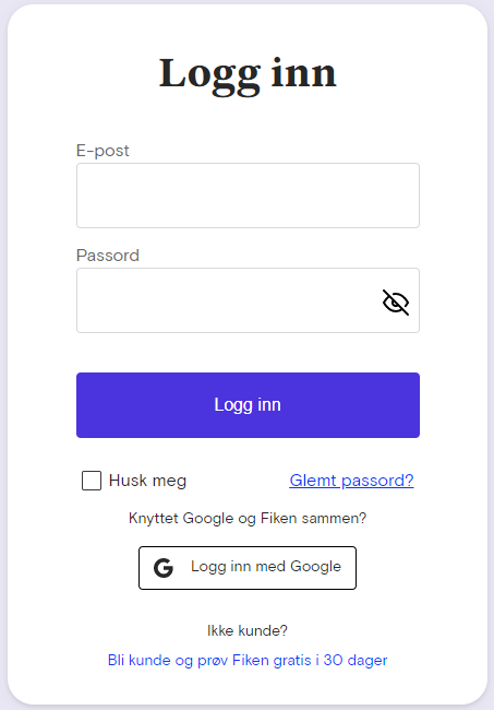 <figure><img src="https://497021537-files.gitbook.io/~/files/v0/b/gitbook-x-prod.appspot.com/o/spaces%2F-LsGm2gYUXX6xCfrrWgU-887967055%2Fuploads%2F9f2yTmzqgLlmkBUVYbWH%2Fimage.png?alt=media&#x26;token=1eaf231e-d31f-4f69-a107-6641643971d6" alt=""><figcaption><p>Log in to Fiken</p></figcaption></figure>