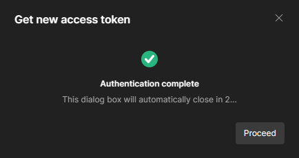Click on this button, a dialog appears showing that it is getting the access token. Eventually it's showing that the authentication was completed. Now click on the "Proceed" button.