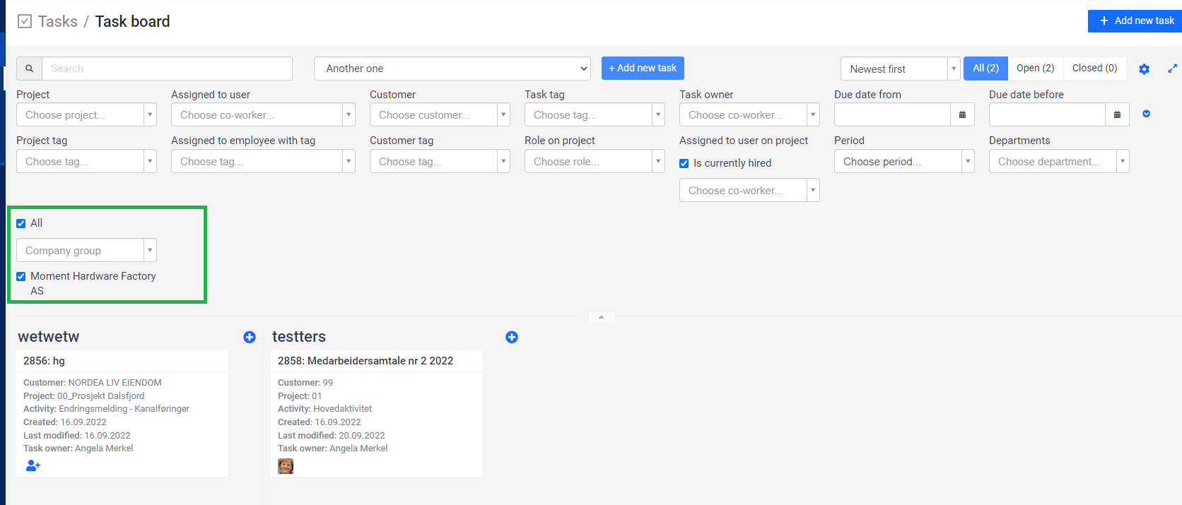 At the moment, the functionality works by displaying all the tasks corresponding to the specific companies int he group under Tasks > Taskboard. Be sure to mark checkboxes both "All" and the correct company in the Company Group