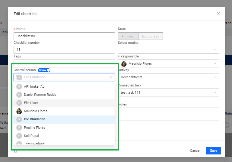In the upper right corner of the checklist, you can define what person is in charge for doing the control. The selected person will receive an email notification when assigned. However, other users can also tick the checkboxes. Due to traceability in the quality system, the logged-in user's name (and date) will be logged when doing this action, even if you have set an overall person as responsible.