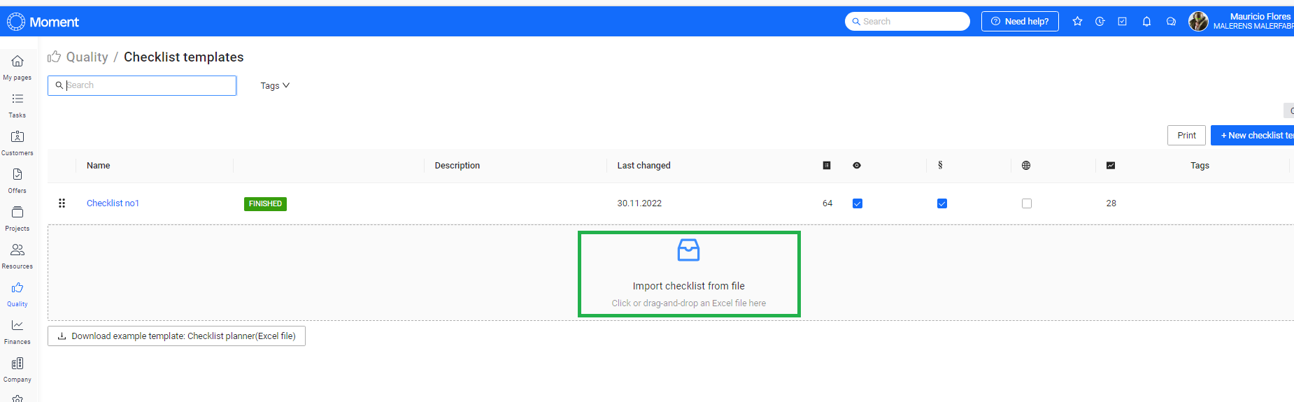 You can import any checklists you might already have into Moment. In order to do this, you need to download our checklist template. You can find the template under Quality > Template checklists: