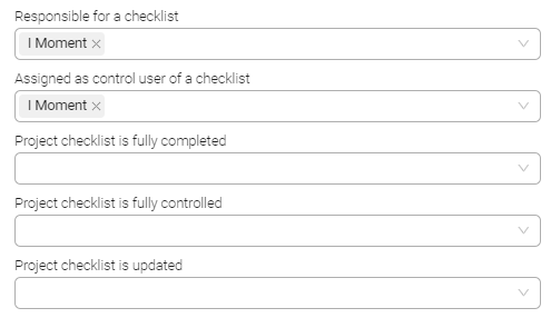 For the notifications "Responsible for a checklist" and "Assigned as a control user of a checklist", you will receive a notification when you are set as responsible or control person of any checklist. The checklist notifications for full completion, control or updates will only be sent if you are designated as the Project Owner (indicated by a blue star):