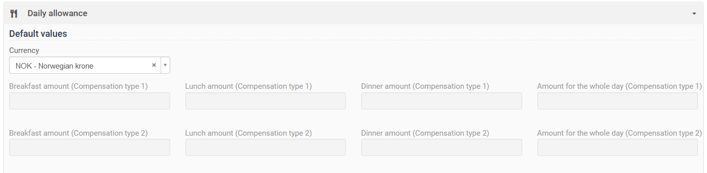 The daily allowance section consists of fields to be used for each type of meal/compensation. These are activated/shown by select what should be available in the "Configuration" section, and the "Supported fields" box. Select those needed for the expense type.