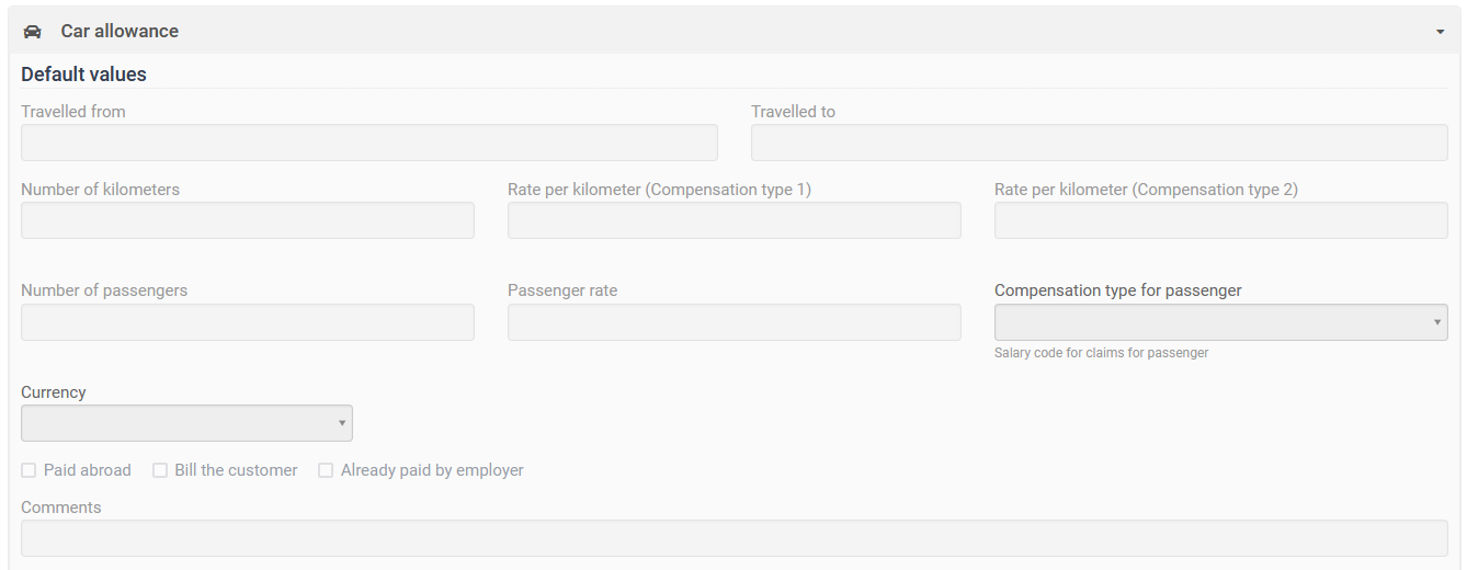 The car allowance section contains the fields used when filling out the travel taken place. In addition there are fields to be used to register rates to be used.