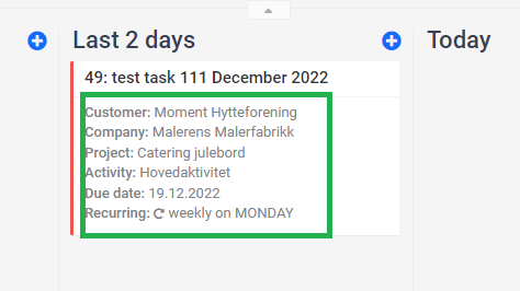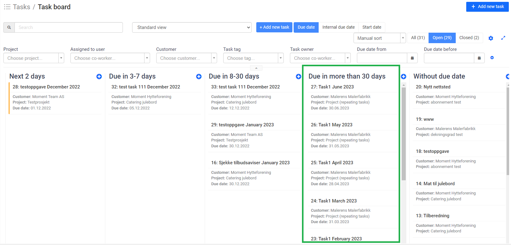 If you want to see how the recurring tasks you have created look in the taskboard, you can click on the taskboard of the project, select "standard view". For example, if the tasks are monthly and due more than 30 days ahead of time, they will appear one after the other in the corresponding tab: