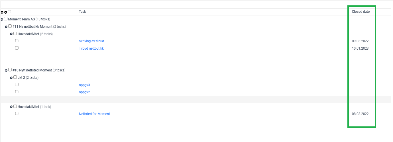 Whenever you close a task, Moment will create a timestamp that shows when the task has been closed. This information will be relevant if you need to keep documnetation regarding whenever tasks have been closed. This information will be available both on the task and on the task report.&#x20;