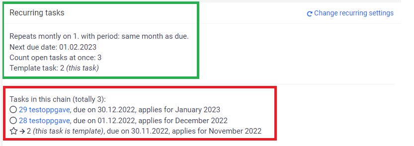 The area marked in green represents the core properties of this specific repeating task. It includes the next due date, the amount of tasks opened at the same time, and it also shows what the original template task is.