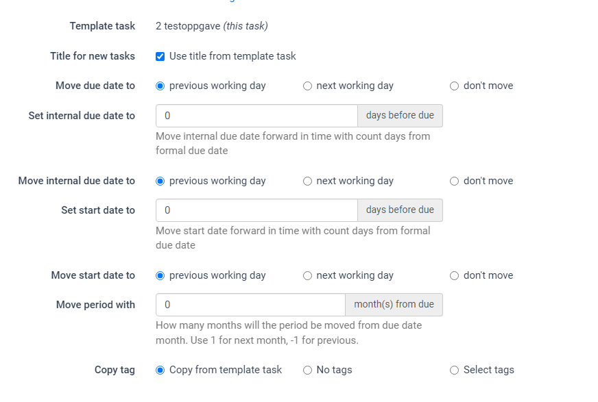 **Move period with:** Here you can decide if the task period will be different from the due date month. For example if a task needs to be done in January, but the due date is in February then the option should be set as "-1" in the corresponding box