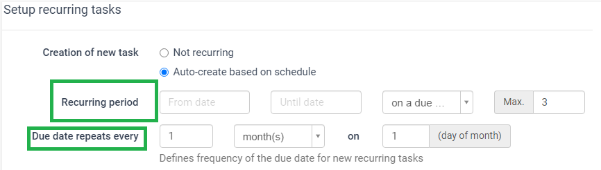 **Due date repeats every**: refers to the specific dates on which new tasks will be created. For example, for a monthly recurring task will repeat itself every 1 month, on a specific date. In this case we have set this to be the first of each month.