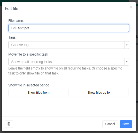 When you click the "edit" botton (marked in green in the picture above) a new modal will appear. This modal allows for some more functionality. In here you can move the file to a specific task in the sequence. You can also show to display the files that have been uploaded earlier.