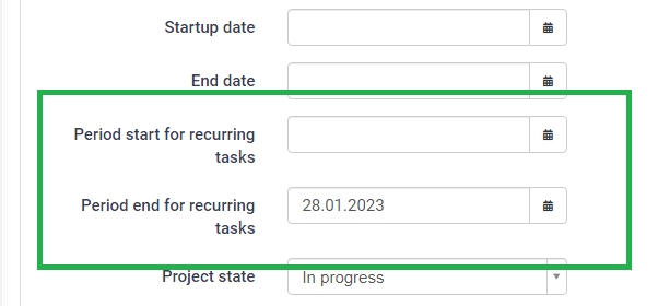 In the project's main page, it is possible to add a specific date from which no other new recurring tasks will be created. This is useful, if for example the customer on the project ends the project on a specific date- *This functionality will keep old tasks, but at the same time stop Moment from creating new tasks once the older tasks are closed*. This will overwrite general rules on a specific task template, so it is a tool used mainly to create exceptions